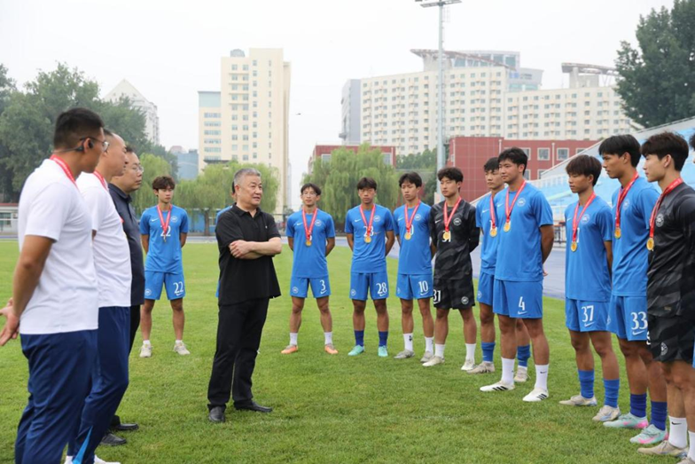 赵长禄走到场边同队员们亲切交流,表示时刻关注着每一位队员场上的精彩表现,观看了本次比赛决赛的网上直播,大家顽强拼搏、不负使命,为学校赢得了荣誉。赵长禄指出,队员们克服了学业与体能的双重压力,在绿茵场上展现青春活力,将敢于拼搏的精神发挥到淋漓尽致,日常的刻苦训练、教练组的战术指导、强大的心理素质等共同成就了比赛的优异成绩,成功卫冕了全国冠军。希望队员们利用假期安心休整、补充能量,未来进一步刻苦训练、追求卓越,持续提升技战术水平和体能储备,保持团队配合的高度默契,争取在亚洲赛事中勇拔头筹、在即将进行的大学生世界杯中取得更好成绩。同时,期待大家积极带动全校学生走向绿茵场、活动在阳光下,大力弘扬校园体育文化,不断增强体魄、磨砺意志,实现全面发展,成为堪当民族复兴重任的时代新人。